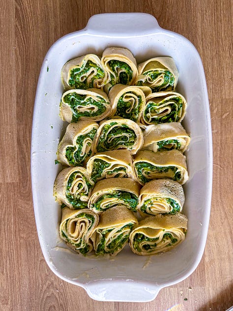 Crêpe Rolls: Filled with a mixture of spinach and ricotta, or whatever wild greens you can forage in your backyard.
