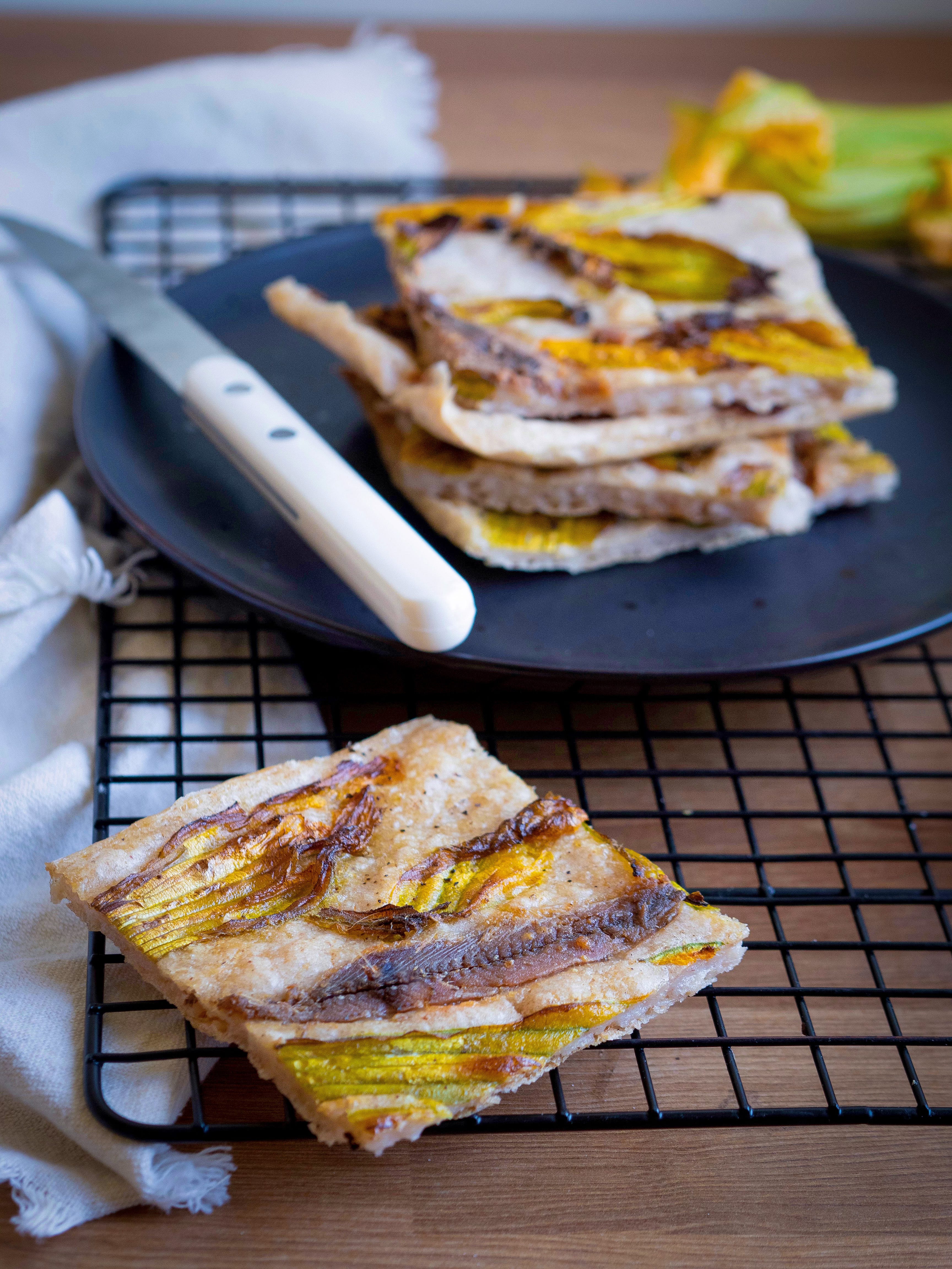 As toppings today I’ve chosen zucchini blossoms and anchovies, but this flatbread is just as delicious with only zucchini blossoms or with a combination of thinly sliced zucchini and onions. If you opt for just vegetables, seeds, or herbs, it will also be completely vegan.
