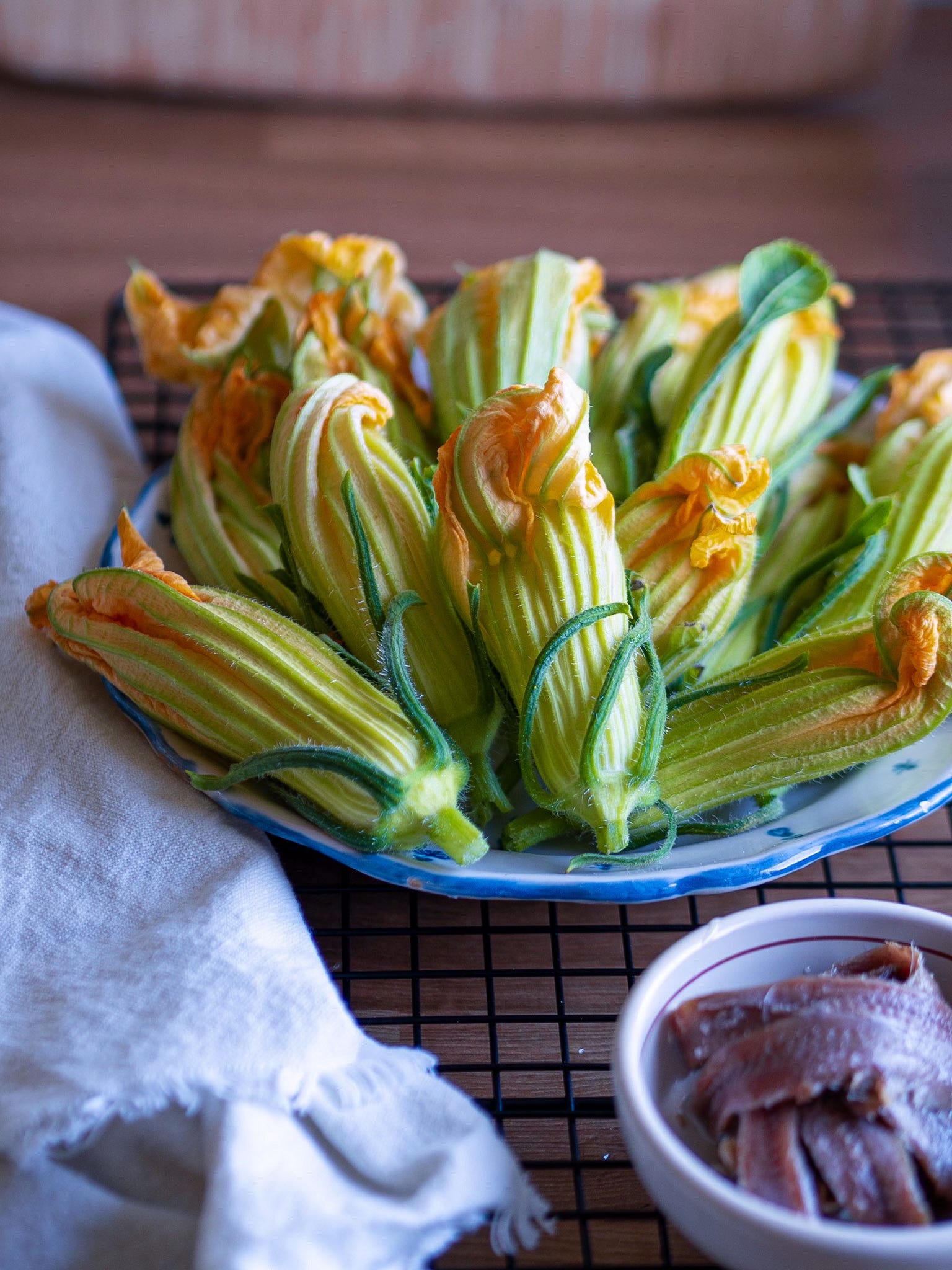 Distribute the zucchini blossoms on the batter, then put pieces of anchovies in between the blossoms.